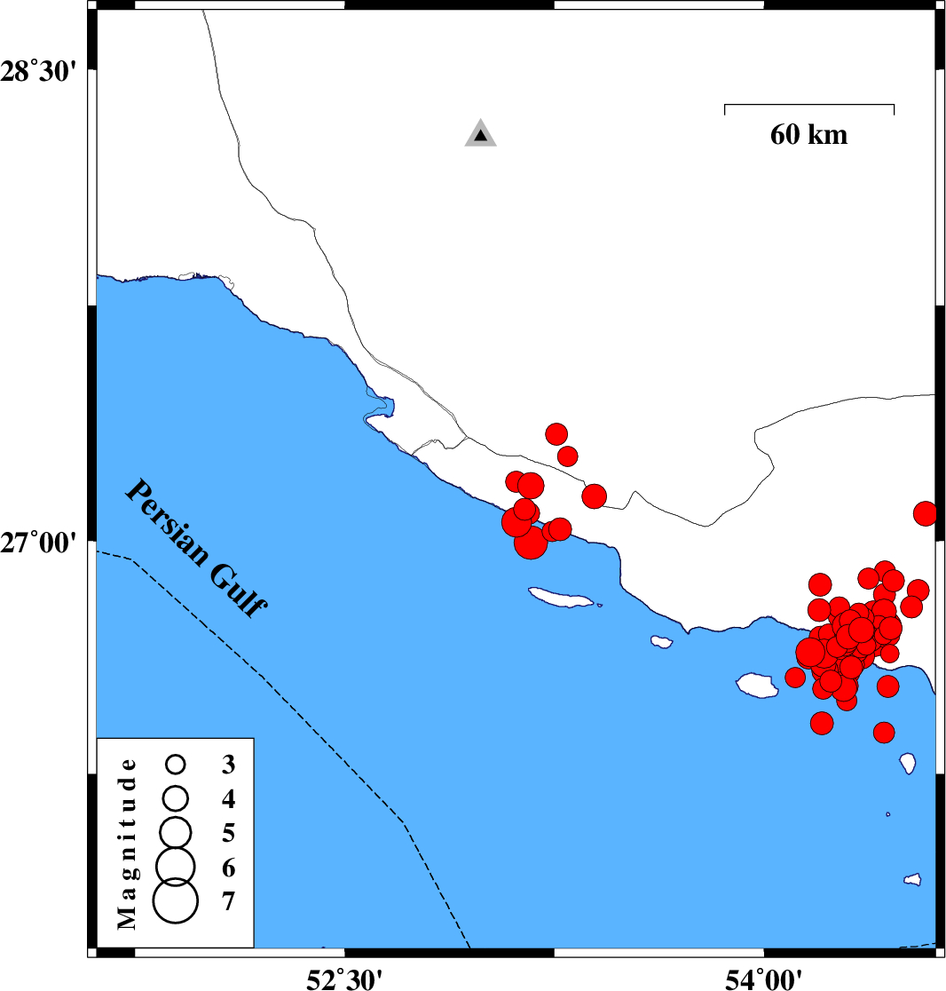 | 2022/06/21 | 07:05:05.4 | 11:35:05.4 | 26.692 | 54.303 | 19 | ML4 | Persian Gulf, 57 km South of Bastak | ||
