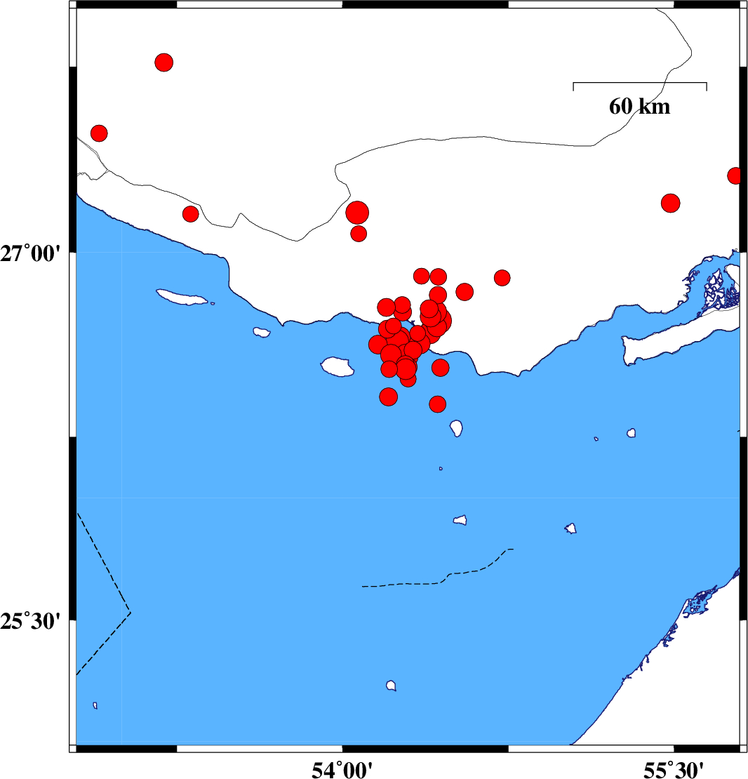 | 2022/06/15 | 11:50:32.2 | 16:20:32.2 | 26.63 | 54.349 | 12 | ML4.2 | Persian Gulf, 63 km South of Bastak | ||