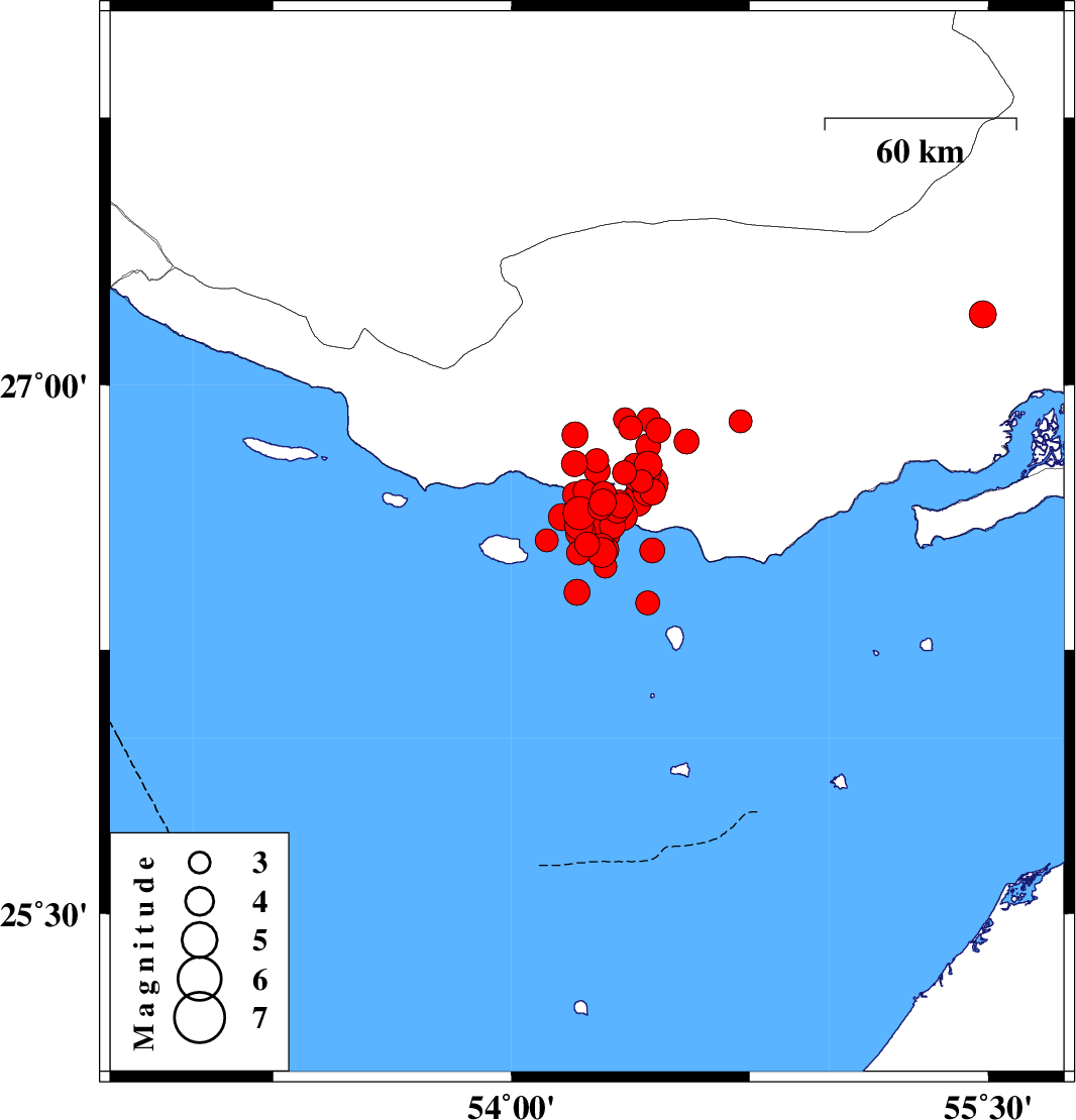 | 2022/06/16 | 20:53:11.2 | 01:23:11.2 | 26.659 | 54.345 | 20 | ML3.5 | Persian Gulf, 60 km South of Bastak | ||