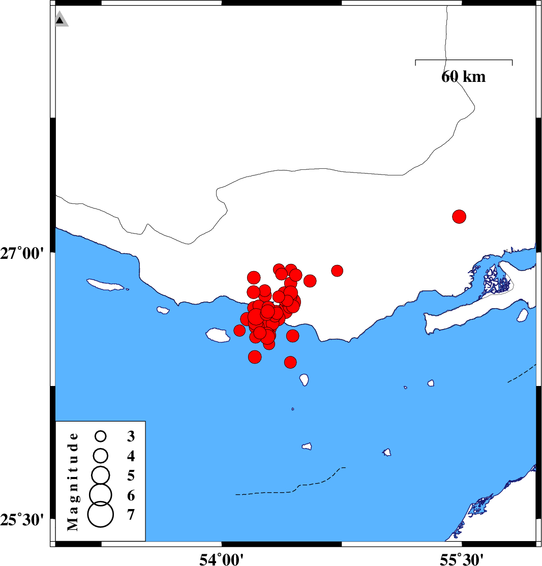 2022/06/16 00:40:46.7 05:10:46.7 26.63854.21512 ML4.7 Persian Gulf, 64 km South-West of Bastak