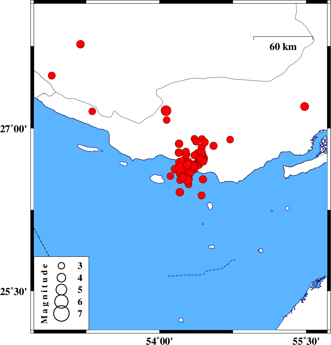 2022/06/16 00:40:46.7 05:10:46.7 26.63854.21512 ML4.7 Persian Gulf, 64 km South-West of Bastak