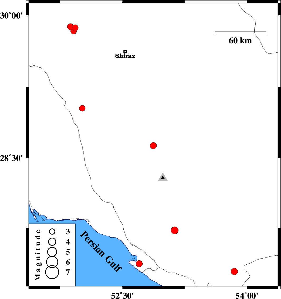 | 2022/11/25 | 05:19:32.5 | 08:49:32.5 | 29.835 | 51.911 | 12 | ML3.2 | Fars Province, 34 km North-East of Kazerun |