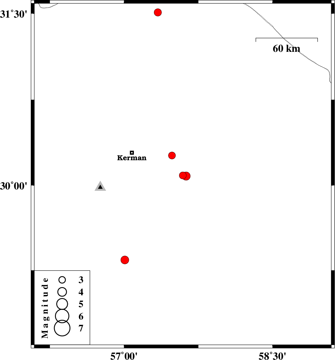| 2022/12/11 | 00:54:16.6 | 04:24:16.6 | 30.262 | 57.483 | 12 | ML3.2 | Kerman Province, 39 km -East of Kerman | ||