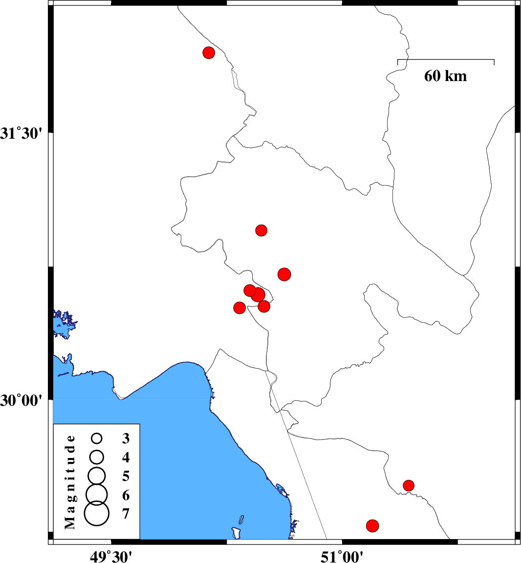 | 2023/01/27 | 06:19:30.8 | 09:49:30.8 | 29.284 | 51.197 | 16 | ML3.6 | Bushehr Province, 3 km of Borazjan | ||