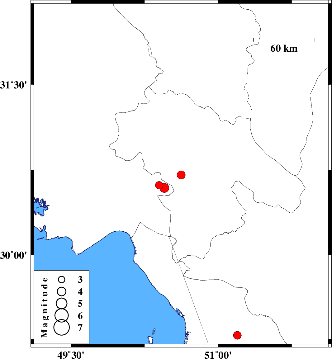 | 2023/01/27 | 06:19:30.8 | 09:49:30.8 | 29.284 | 51.197 | 16 | ML3.6 | Bushehr Province, 3 km of Borazjan |