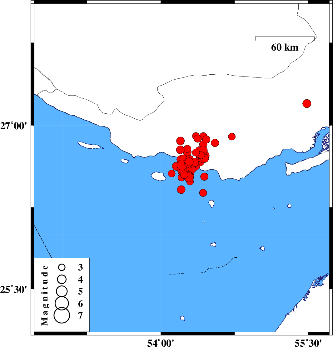 | 2022/06/16 | 20:53:11.2 | 01:23:11.2 | 26.659 | 54.345 | 20 | ML3.5 | Persian Gulf, 60 km South of Bastak | ||