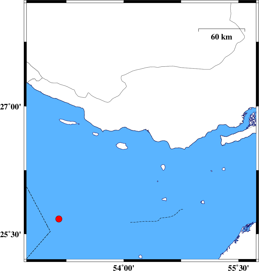 2022/06/15 05:55:00.6 10:25:00.6 26.63854.24715 ML4.6 Persian Gulf, 63 km South-West of Bastak
