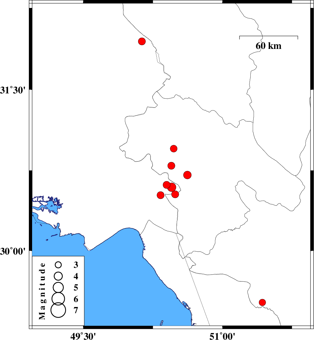 | 2023/01/02 | 13:56:27.8 | 17:26:27.8 | 31.944 | 50.132 | 15 | ML3.5 | Khoozestan Province, 28 km North-East of Izeh |