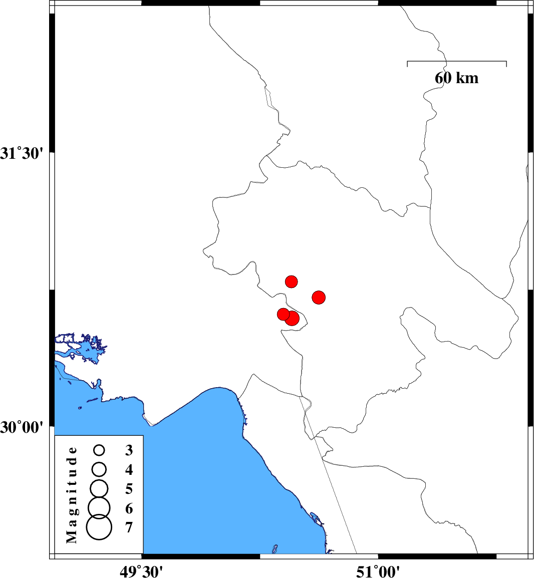 | 2023/01/27 | 09:36:39.4 | 13:06:39.4 | 30.593 | 50.452 | 16 | ML4.3 | Khoozestan Province, 20 km -East of Behbahan |