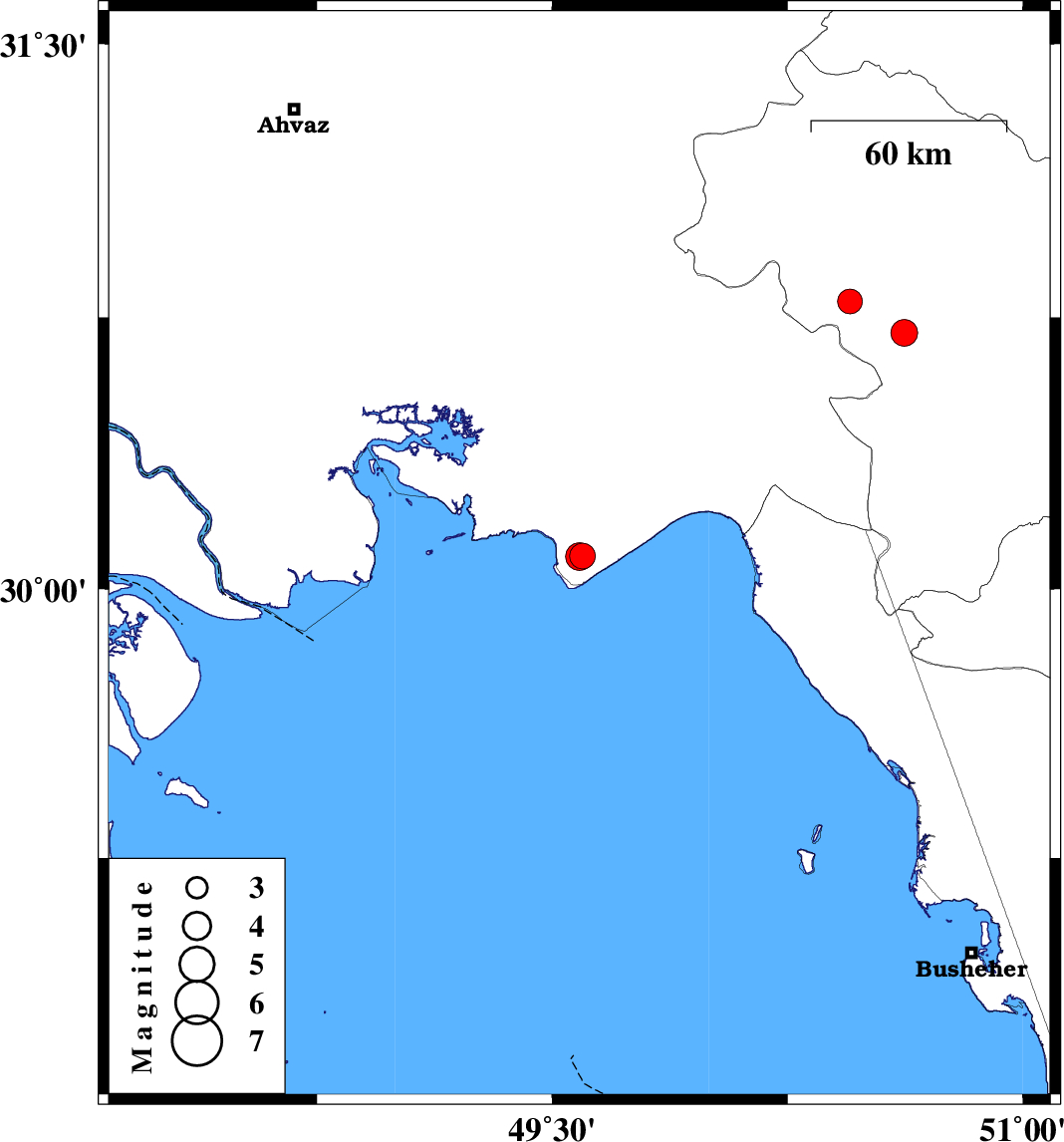 | 2023/02/04 | 16:00:51.4 | 19:30:51.4 | 30.09 | 49.587 | 12 | ML3.9 | Khoozestan Province, 20 km South-West of Hendijan | ||