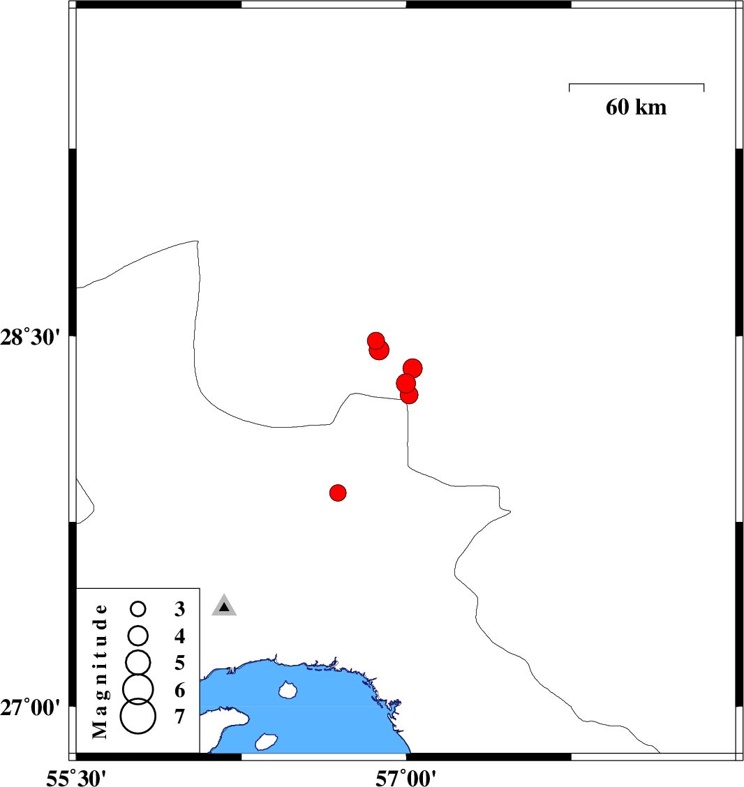 | 2023/02/09 | 12:29:54.8 | 15:59:54.8 | 28.369 | 57.029 | 12 | ML3.9 | Kerman Province, 77 km South-West of Jiroft | ||