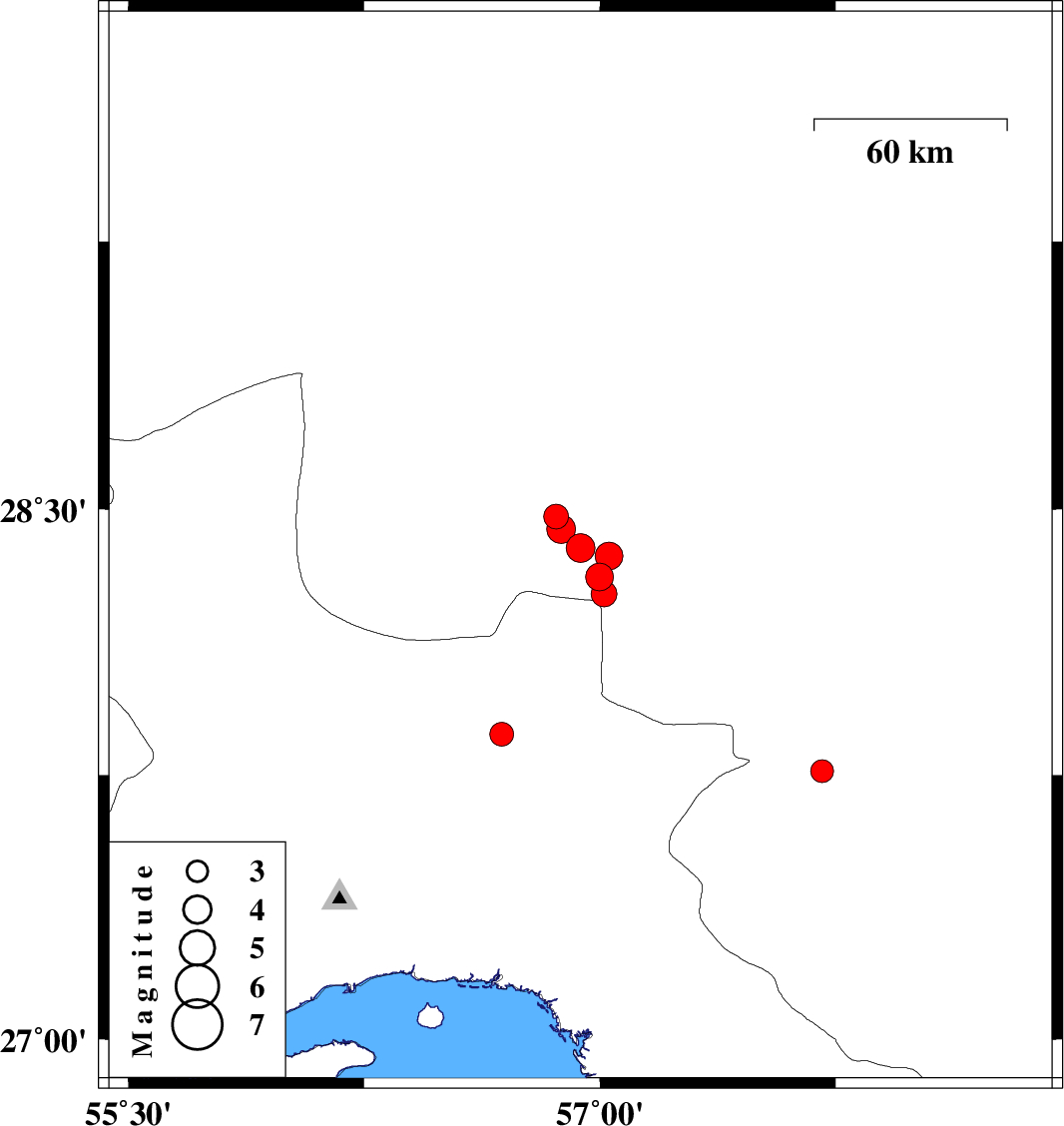 | 2023/01/25 | 17:19:00.8 | 20:49:00.8 | 27.761 | 57.706 | 12 | ML3.3 | Kerman Province, 21 km South of Kahnuj |