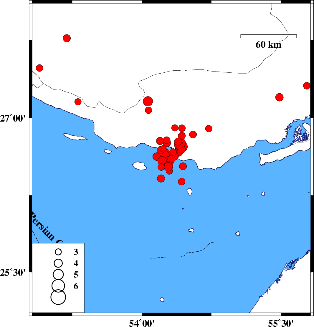 | 2022/06/15 | 11:50:32.2 | 16:20:32.2 | 26.63 | 54.349 | 12 | ML4.2 | Persian Gulf, 63 km South of Bastak | ||