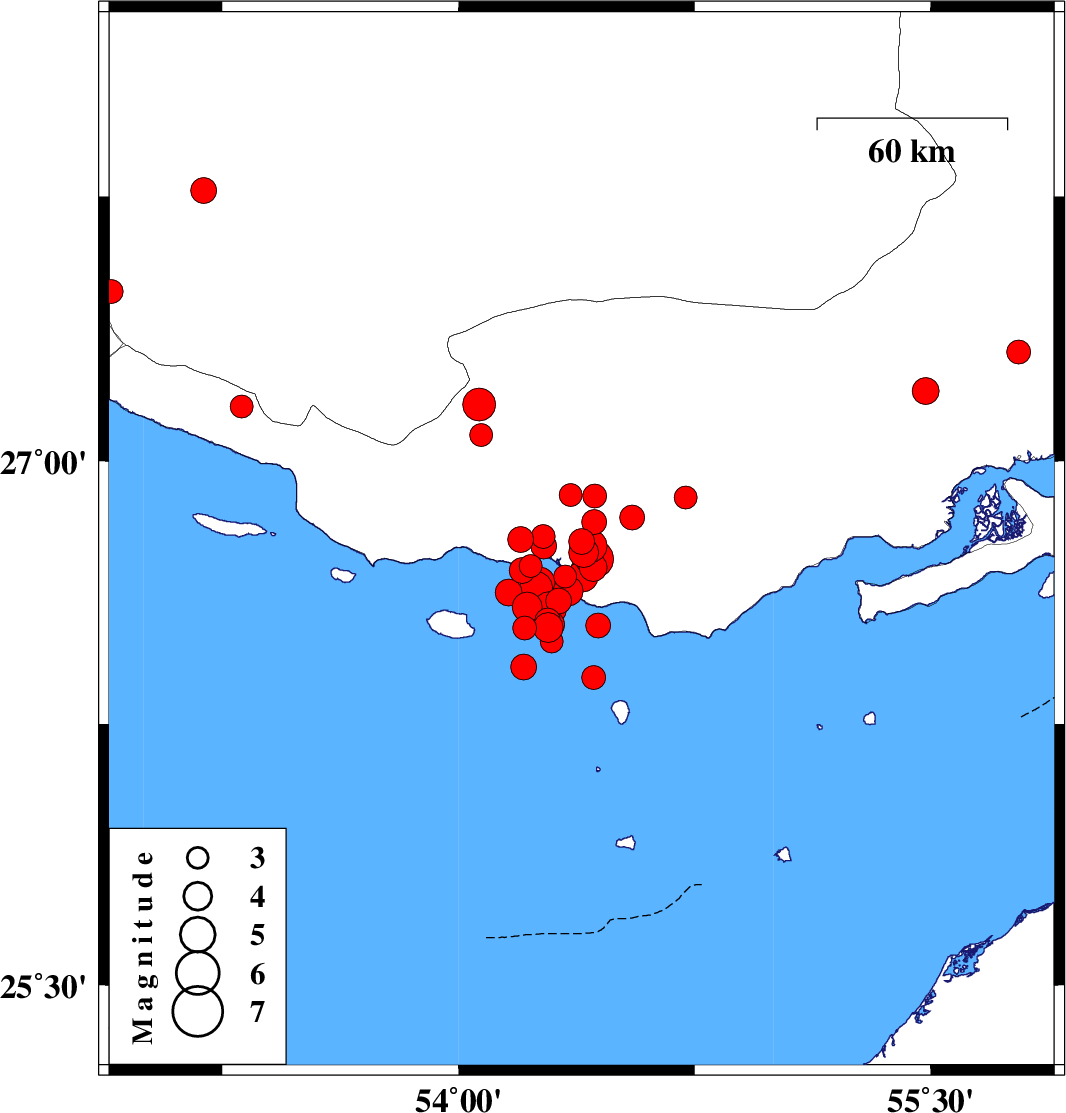 | 2022/06/14 | 14:09:42.1 | 18:39:42.1 | 26.654 | 54.258 | 12 | ML4.4 | Persian Gulf, 61 km South-West of Bastak | ||