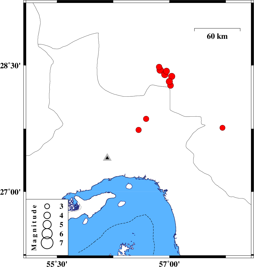 | 2023/01/25 | 17:19:00.8 | 20:49:00.8 | 27.761 | 57.706 | 12 | ML3.3 | Kerman Province, 21 km South of Kahnuj |