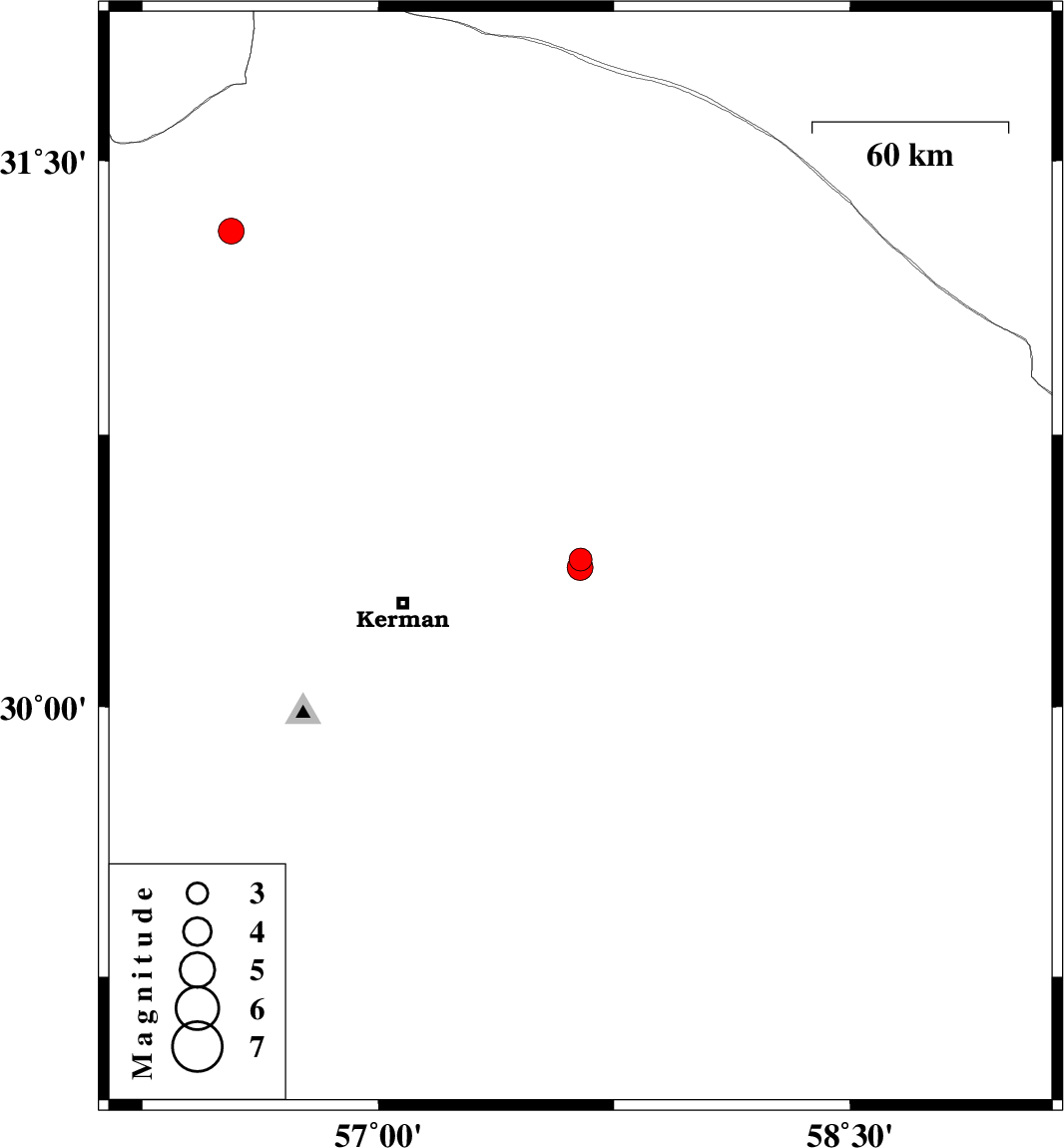 | 2023/02/23 | 10:54:02.5 | 14:24:02.5 | 30.407 | 57.643 | 12 | ML3.2 | Kerman Province, 56 km North-East of Kerman | ||