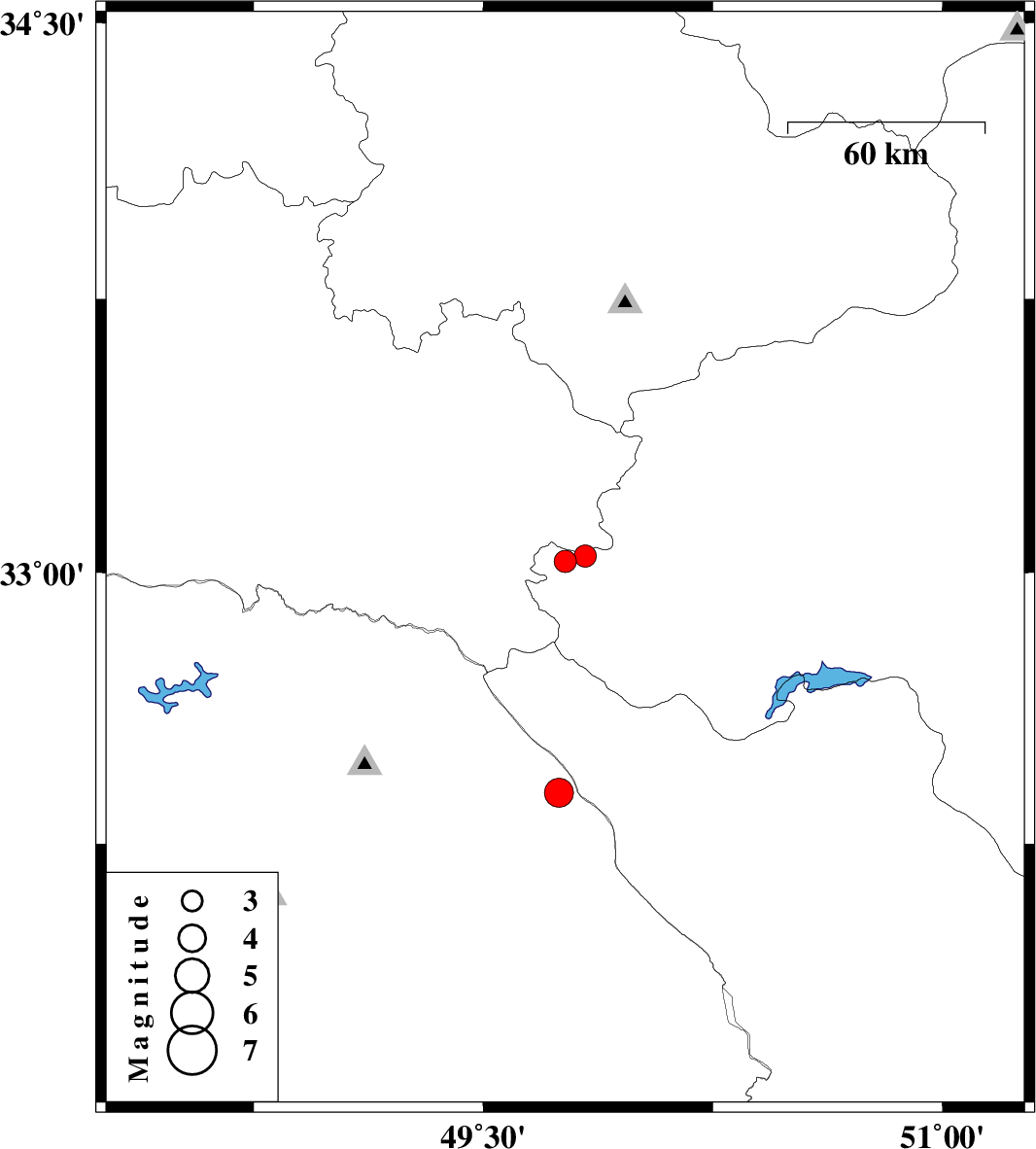 | 2023/01/30 | 17:40:26.6 | 21:10:26.6 | 33.045 | 49.833 | 10 | ML3.3 | Esfahan Province, 28 km North-West of Fereydunshahr |