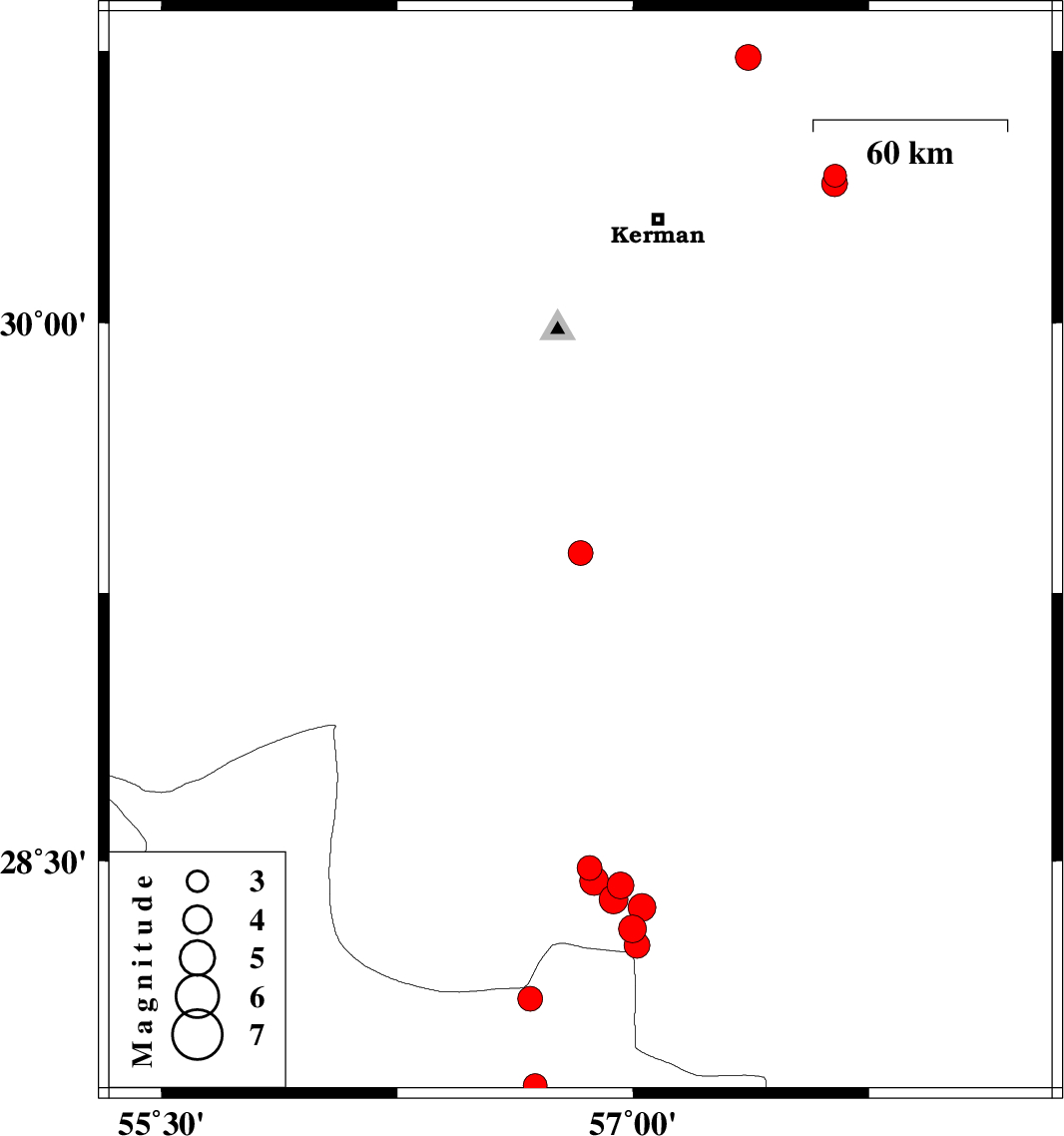 | 2023/02/23 | 10:54:02.5 | 14:24:02.5 | 30.407 | 57.643 | 12 | ML3.2 | Kerman Province, 56 km North-East of Kerman | ||