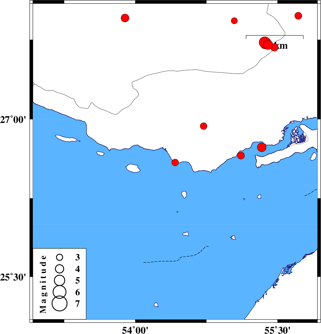 | 2023/02/27 | 13:07:23.7 | 16:37:23.7 | 26.934 | 54.721 | 10 | ML3.2 | Hormozgan Province, 47 km North-West of Bandar-e lengeh | ||