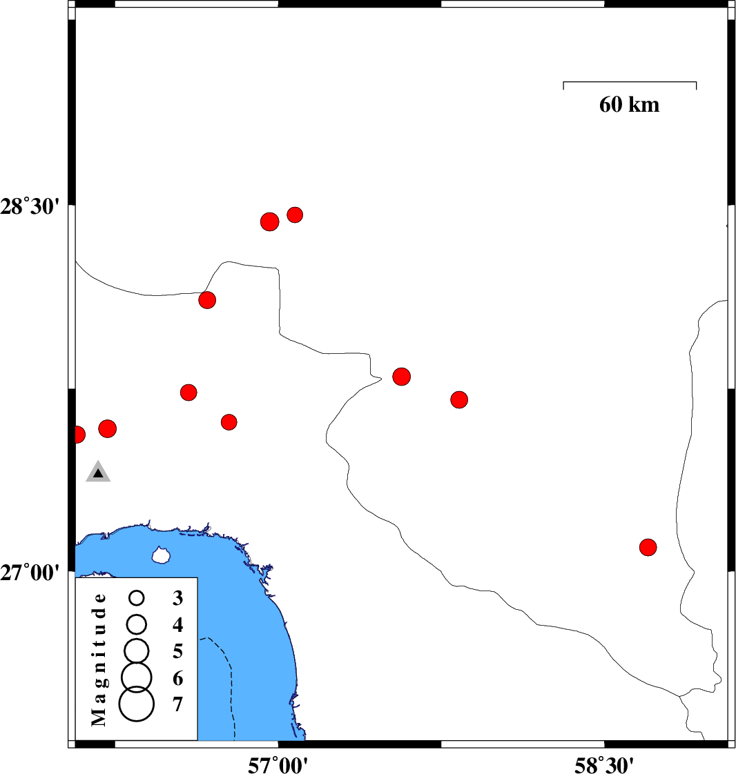 | 2023/02/19 | 00:39:41.1 | 04:09:41.1 | 27.098 | 58.701 | 12 | ML3.5 | Kerman Province, 124 km South-East of Manujan | ||