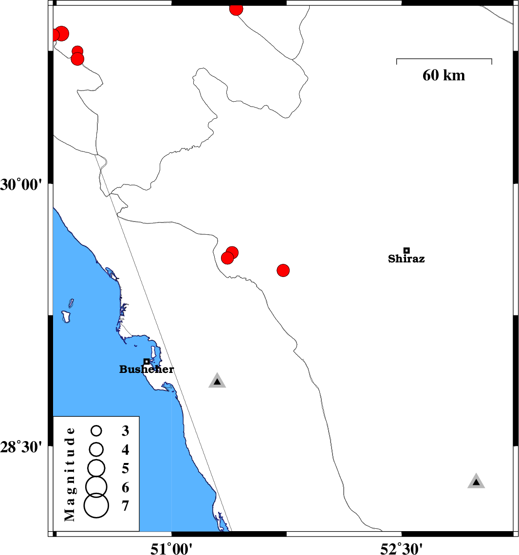 | 2023/03/16 | 22:03:18.8 | 01:33:18.8 | 29.506 | 51.727 | 12 | ML3.6 | Fars Province, 15 km South of Kazerun | ||