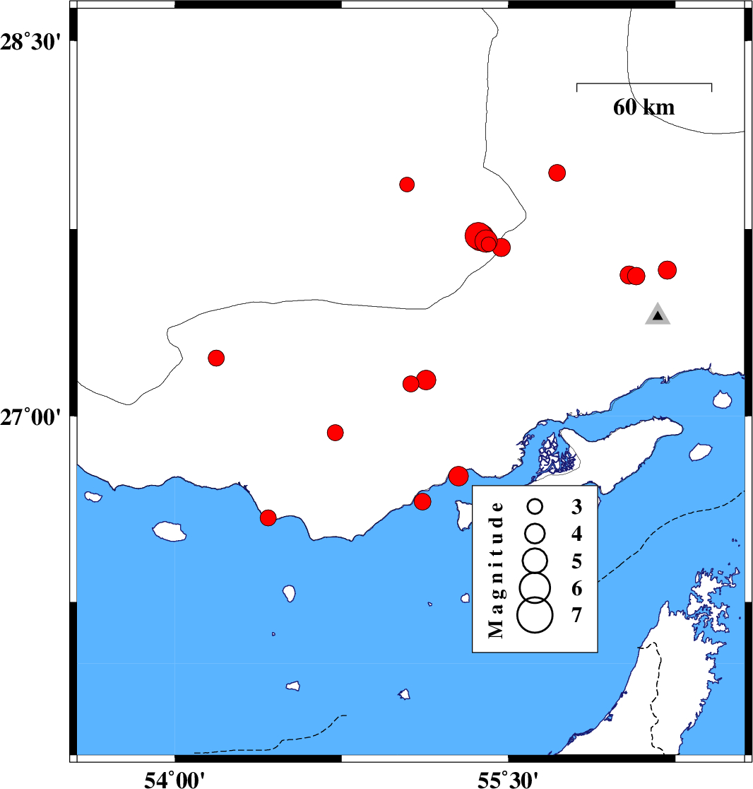 | 2023/03/07 | 17:55:56.0 | 21:25:56.0 | 26.59 | 54.42 | 12 | ML3.2 | Persian Gulf, 43 km -West of Bandar-e lengeh | ||