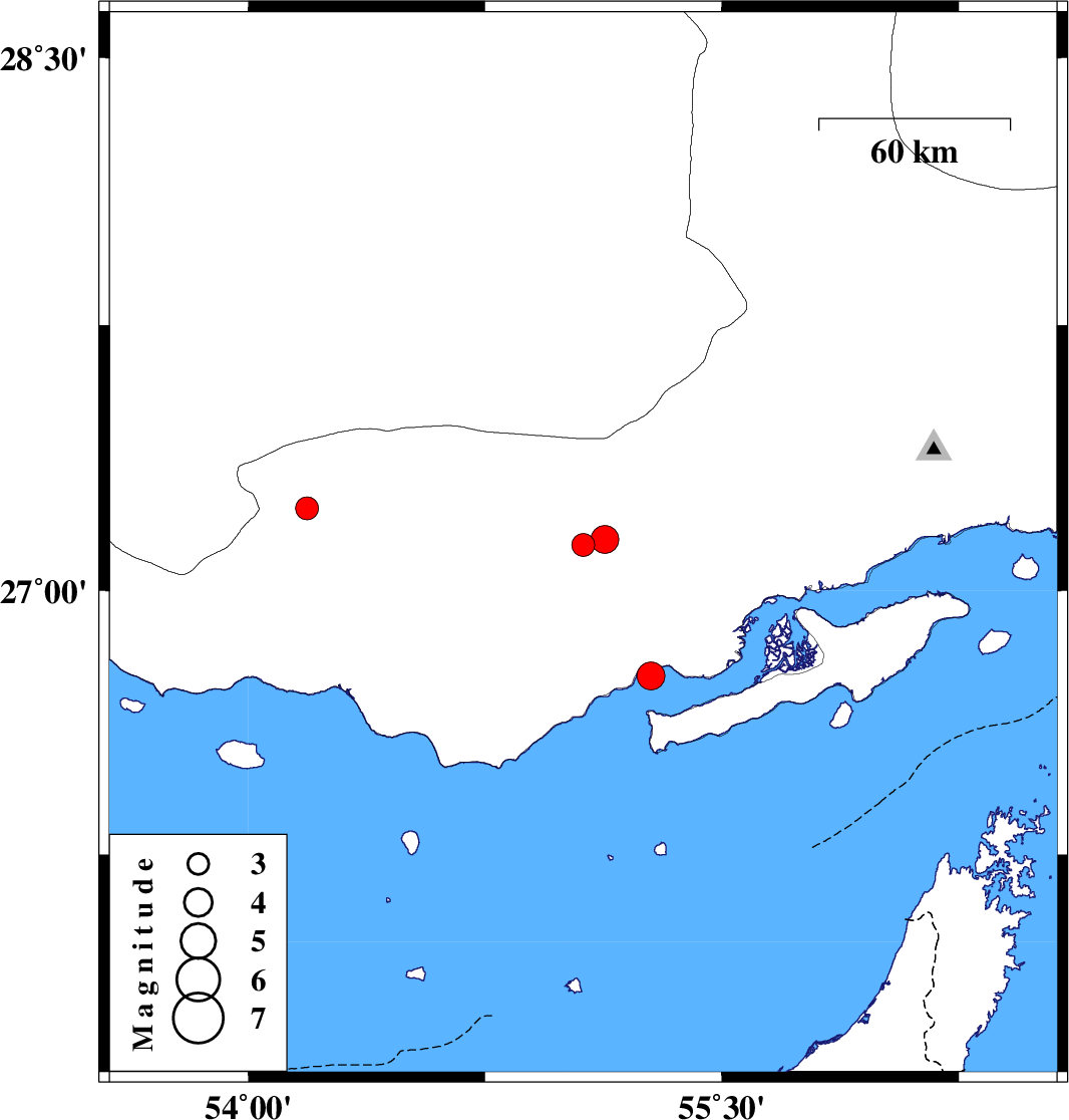 | 2023/03/13 | 09:09:19.4 | 12:39:19.4 | 26.758 | 55.276 | 12 | ML3.9 | Persian Gulf, 50 km North-East of Bandar-e lengeh |