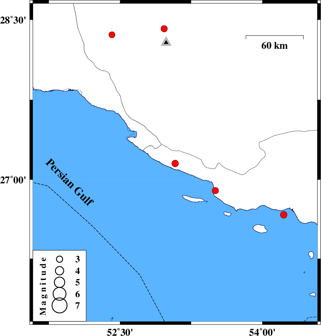 | 2023/03/29 | 16:41:17.8 | 20:11:17.8 | 26.666 | 54.225 | 12 | ML3.3 | Persian Gulf, 61 km South-West of Bastak | ||