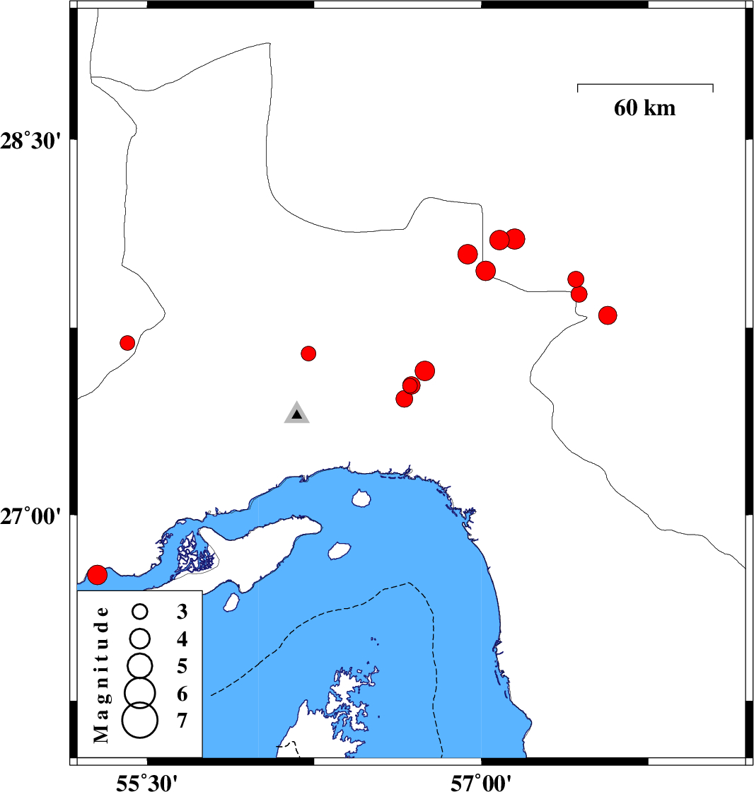 | 2023/04/03 | 03:55:05.0 | 07:25:05.0 | 28.043 | 56.938 | 12 | ML4 | Hormozgan Province, 75 km -West of Kahnuj | ||