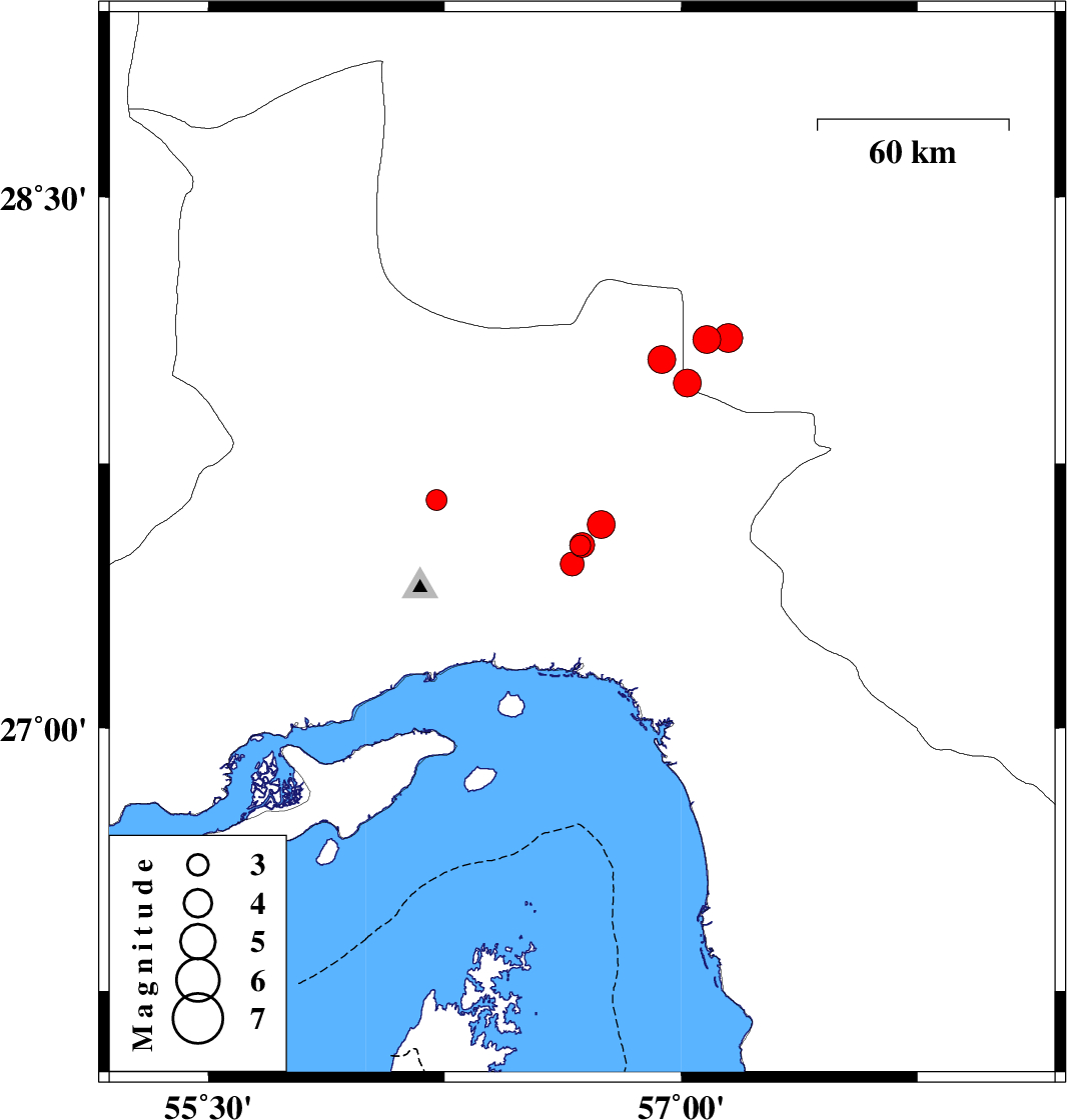 | 2023/04/03 | 03:55:05.0 | 07:25:05.0 | 28.043 | 56.938 | 12 | ML4 | Hormozgan Province, 75 km -West of Kahnuj |