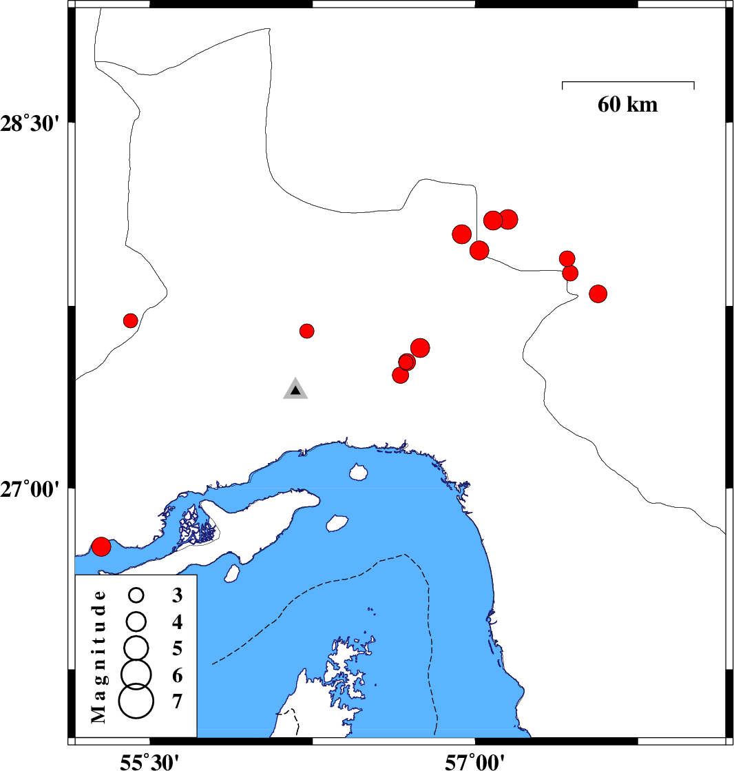 | 2023/04/03 | 03:55:05.0 | 07:25:05.0 | 28.043 | 56.938 | 12 | ML4 | Hormozgan Province, 75 km -West of Kahnuj | ||