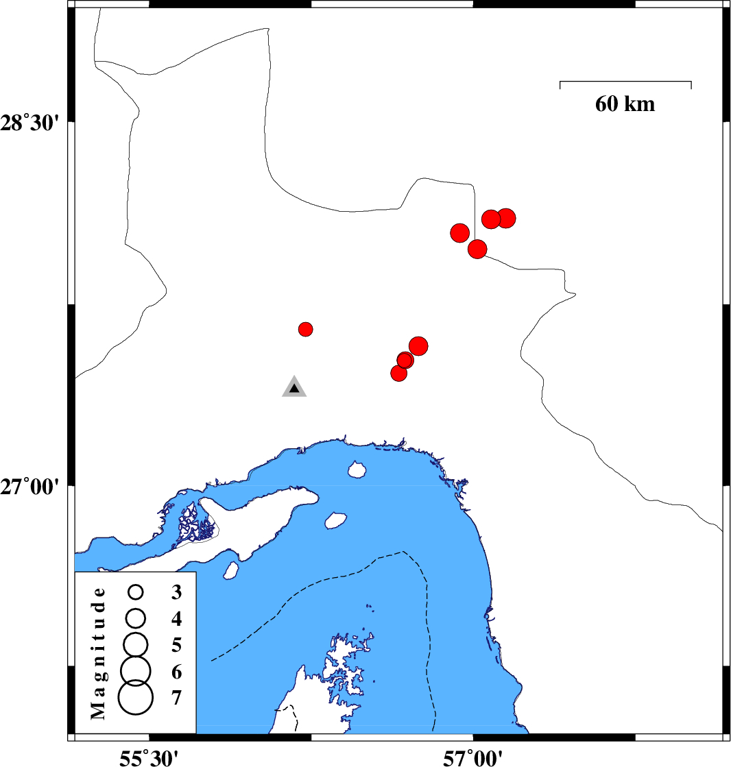 | 2023/04/03 | 03:55:05.0 | 07:25:05.0 | 28.043 | 56.938 | 12 | ML4 | Hormozgan Province, 75 km -West of Kahnuj |