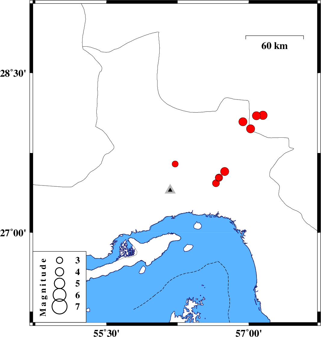 | 2023/04/03 | 03:55:05.0 | 07:25:05.0 | 28.043 | 56.938 | 12 | ML4 | Hormozgan Province, 75 km -West of Kahnuj |