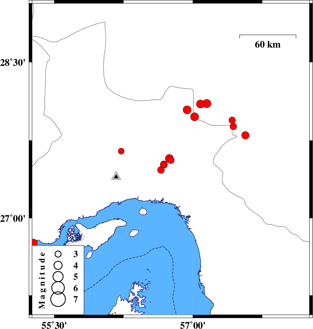 | 2023/04/03 | 03:55:05.0 | 07:25:05.0 | 28.043 | 56.938 | 12 | ML4 | Hormozgan Province, 75 km -West of Kahnuj | ||
