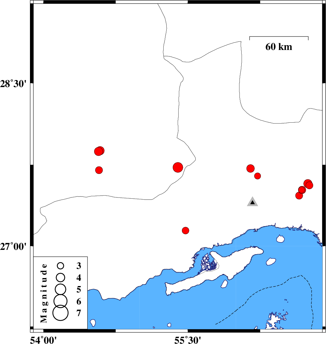 | 2023/03/29 | 16:41:17.8 | 20:11:17.8 | 26.666 | 54.225 | 12 | ML3.3 | Persian Gulf, 61 km South-West of Bastak |