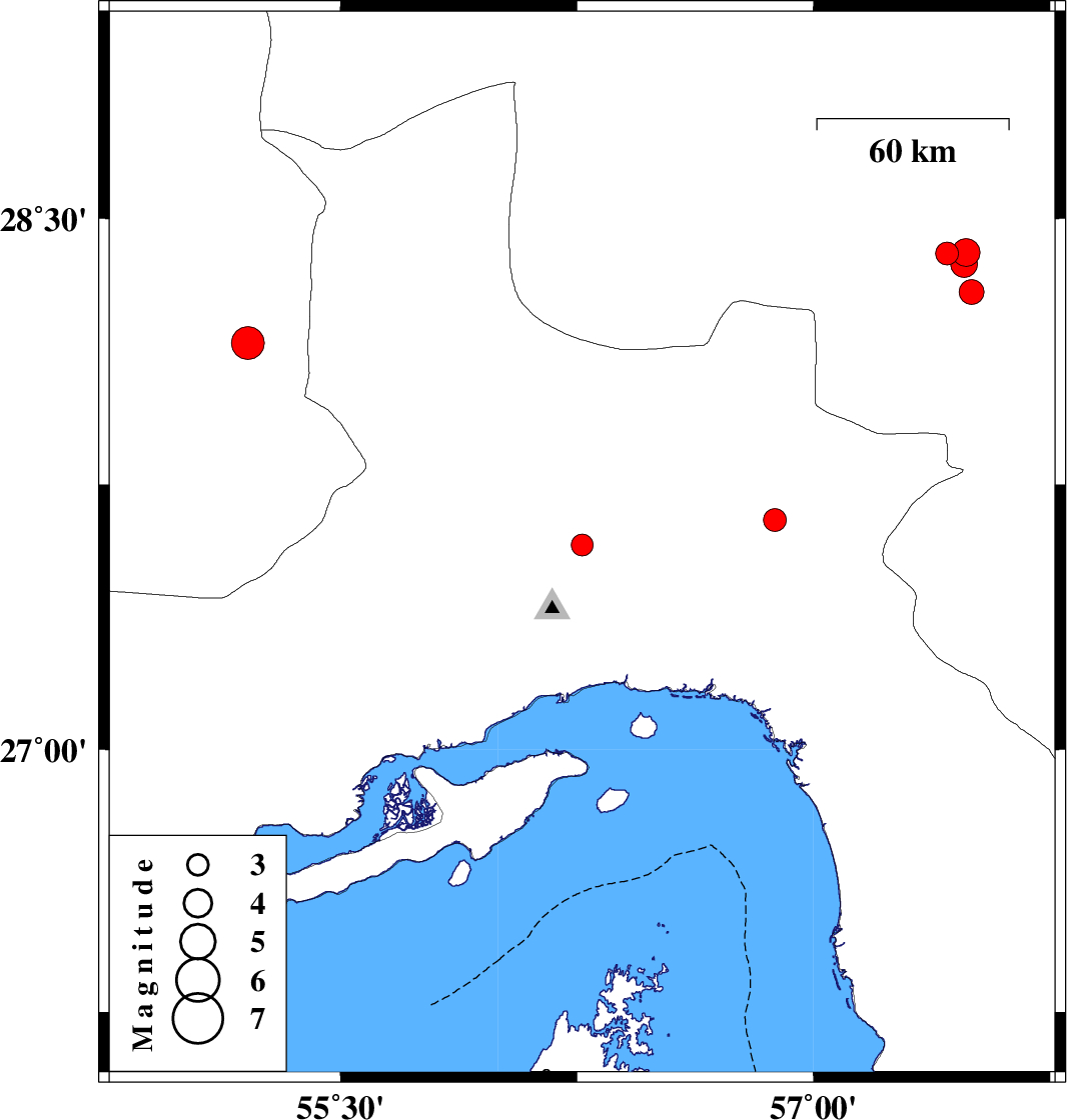 | 2022/03/15 | 15:43:21.3 | 19:13:21.3 | 27.65 | 56.877 | 12 | ML3.3 | Hormozgan Province, 44 km North-West of Dehbarez |