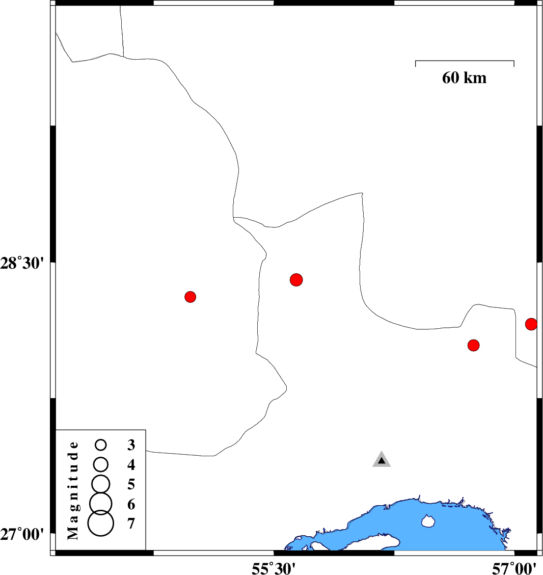 | 2023/05/14 | 12:36:29.4 | 16:06:29.4 | 28.159 | 57.105 | 12 | ML3.4 | Kerman Province, 62 km North-West of Kahnuj | ||