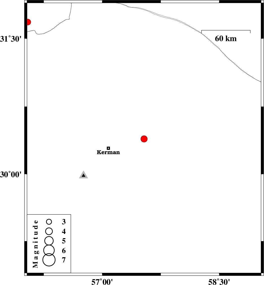 | 2023/05/18 | 13:48:57.1 | 17:18:57.1 | 30.391 | 57.536 | 8 | ML3.8 | Kerman Province, 45 km North-East of Kerman | ||