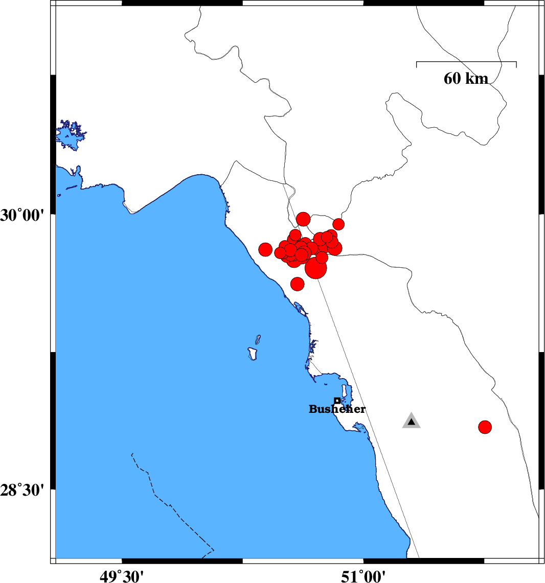 | 2021/04/19 | 04:22:19.6 | 08:52:19.6 | 29.827 | 50.61 | 12 | ML3.2 | Bushehr Province, 30 km North of Bandar-e genaveh | ||