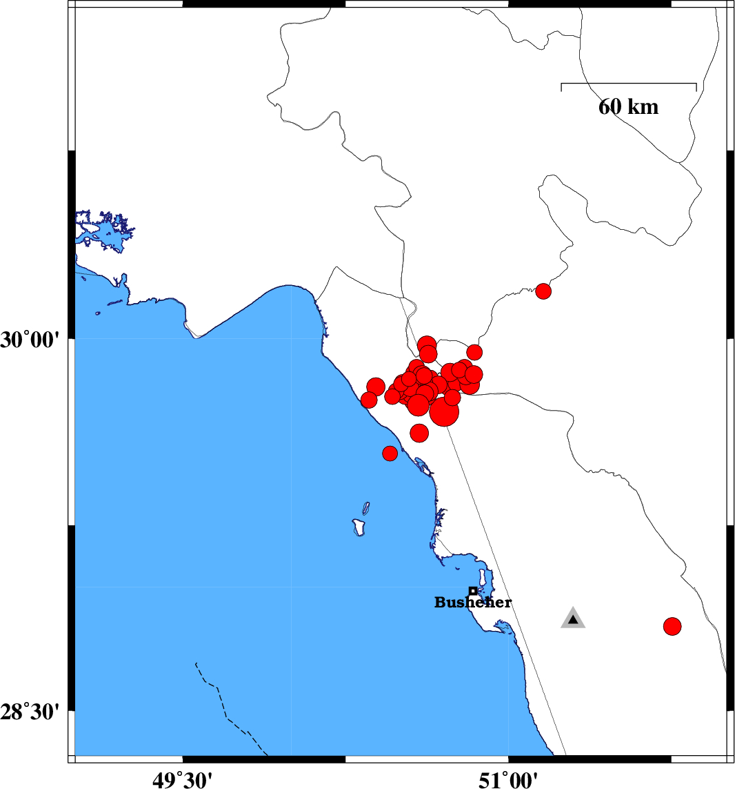 | 2021/04/19 | 04:22:19.6 | 08:52:19.6 | 29.827 | 50.61 | 12 | ML3.2 | Bushehr Province, 30 km North of Bandar-e genaveh | ||