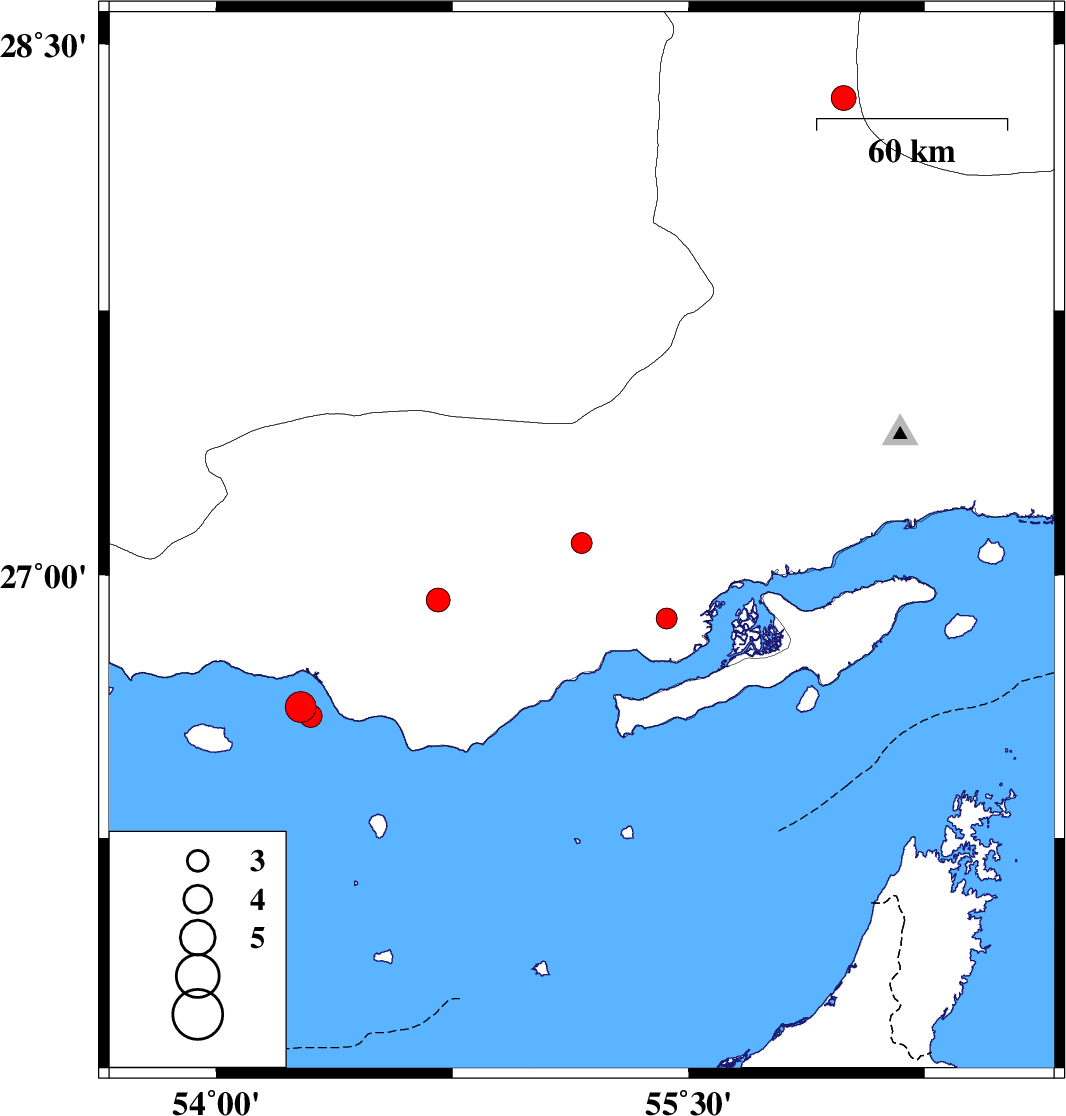 2023/09/02 | 01:55:08.5 | 05:25:08.5 | 26.625 | 54.268 | 12 | ML4.4 | Persian Gulf, 64 km South of Bastak | ||