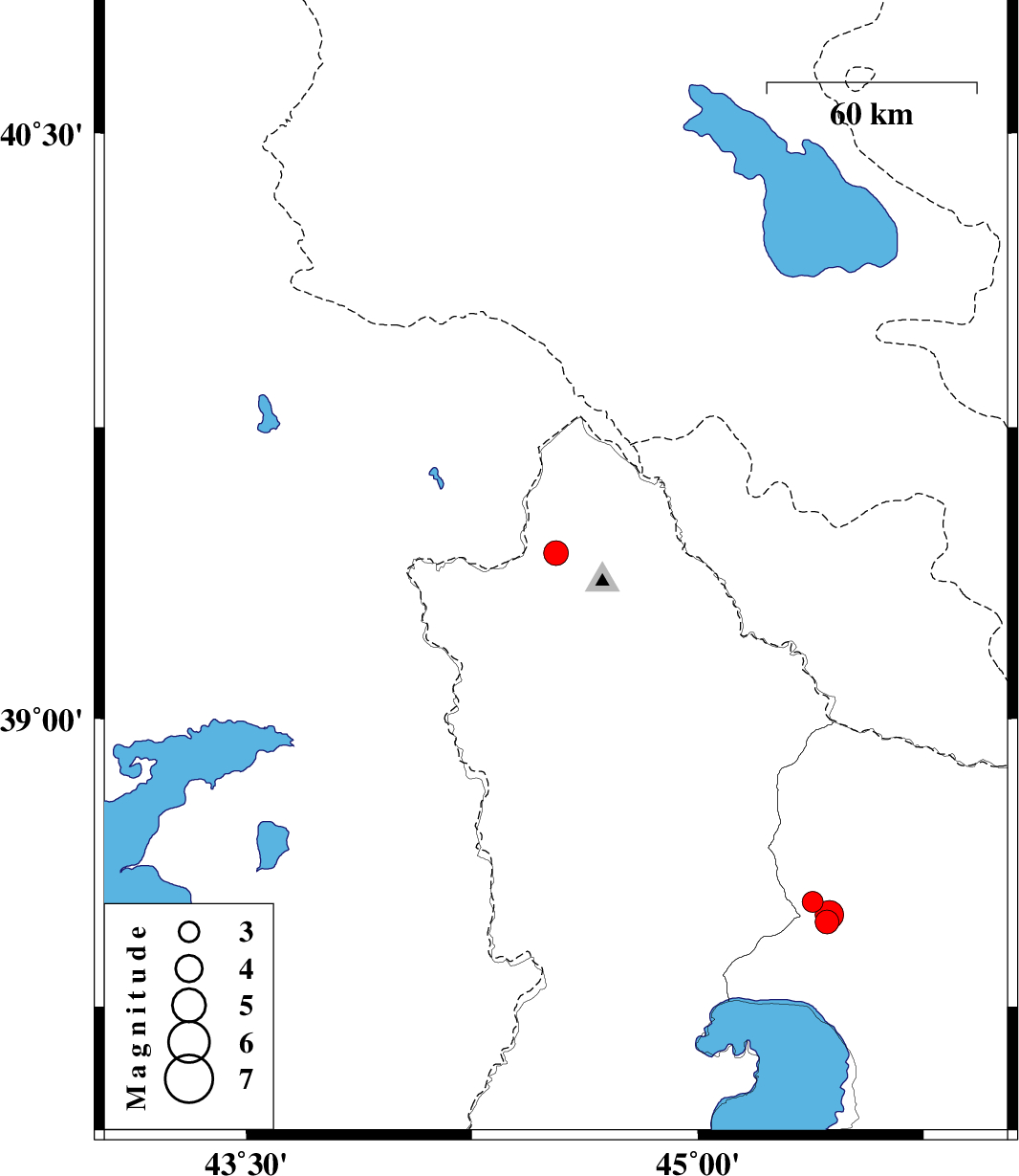 | 2023/09/26 | 19:19:27.3 | 22:49:27.3 | 39.428 | 44.529 | 12 | ML3.6 | Azarbaijan Gharbi Province, 16 km North of Maku | ||