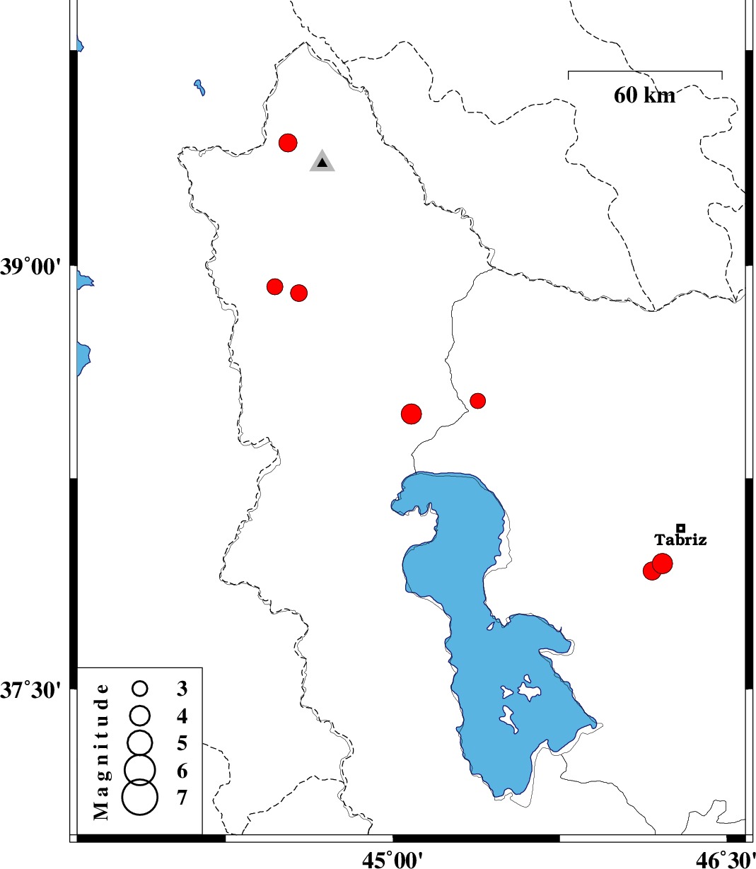 | 2023/09/24 | 06:28:46.6 | 09:58:46.6 | 38.524 | 45.382 | 13 | ML3.1 | Azarbaijan Sharghi Province, 38 km -East of Khoy |