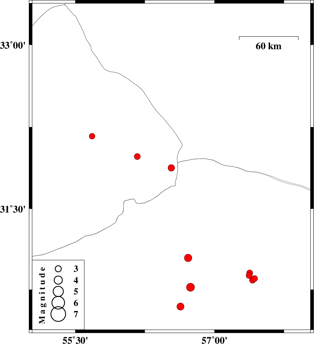 | 2023/09/29 | 01:39:12.4 | 05:09:12.4 | 30.904 | 57.38 | 12 | ML3 | Kerman Province, 78 km -East of Zarand |