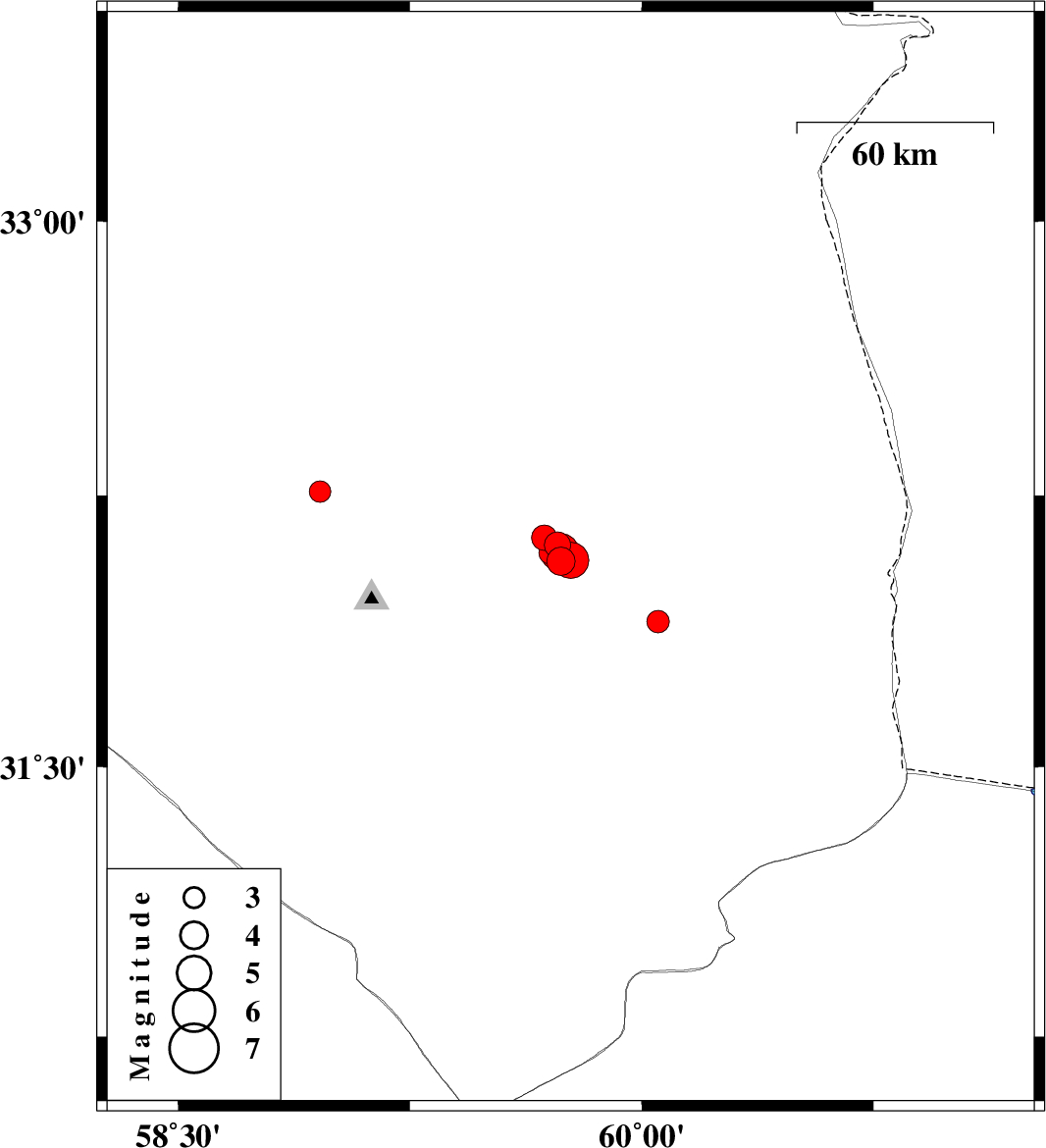 | 2023/10/26 | 20:34:11.4 | 00:04:11.4 | 32.095 | 59.737 | 8 | ML5.4 | Khorasan(south) Province, 59 km South of Sarbisheh | ||