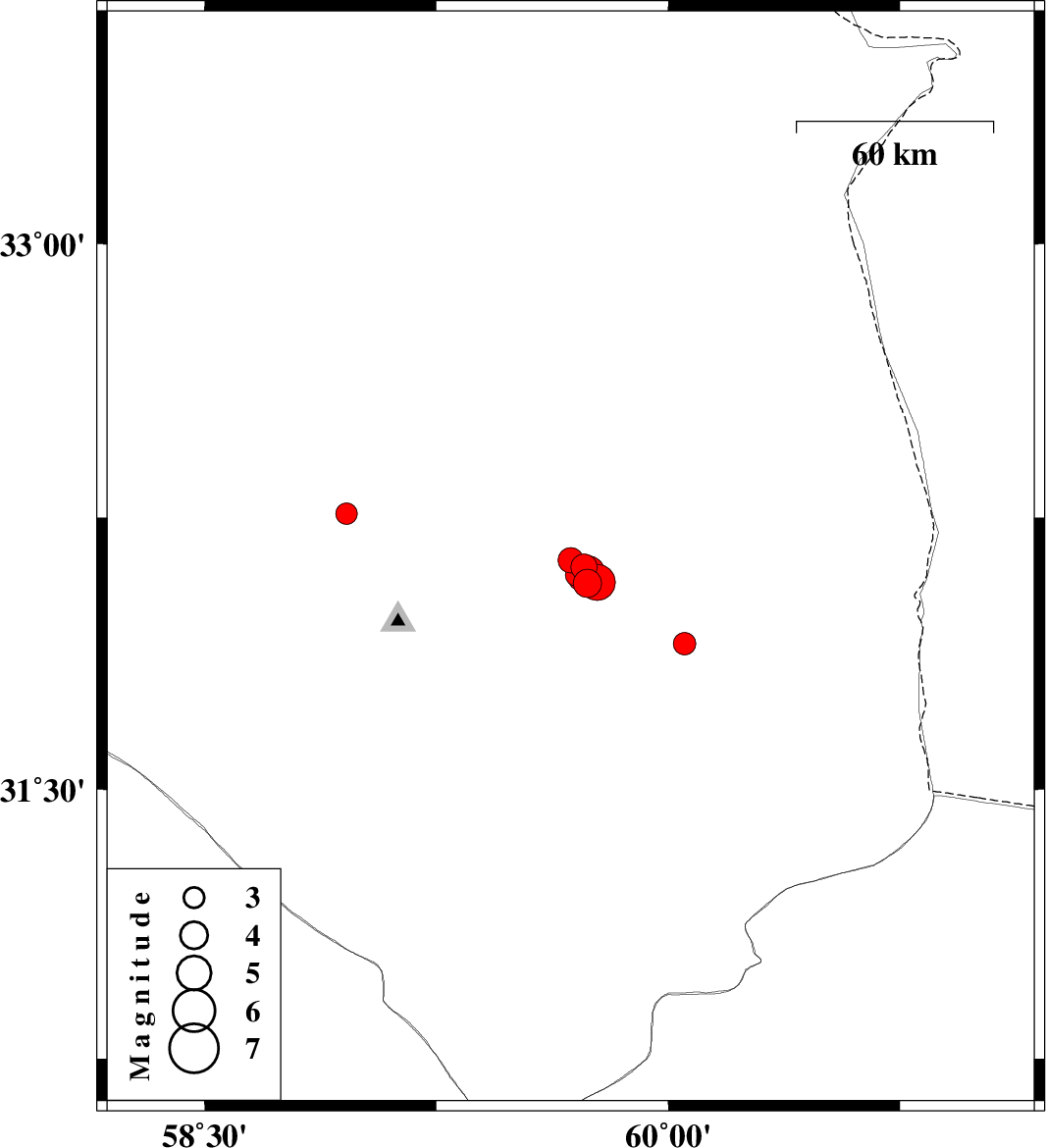 | 2023/10/26 | 20:34:11.4 | 00:04:11.4 | 32.095 | 59.737 | 8 | ML5.4 | Khorasan(south) Province, 59 km South of Sarbisheh | ||
