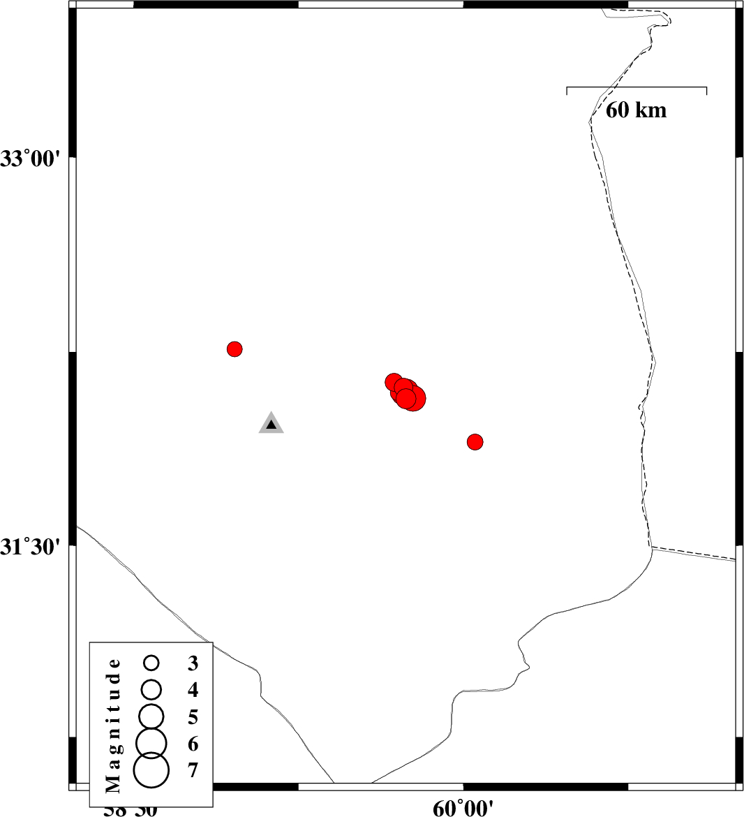 2023/10/27 12:47:25.8 16:17:25.8 32.08959.72410 ML4.5 Khorasan(south) Province, 60 km South of Sarbisheh