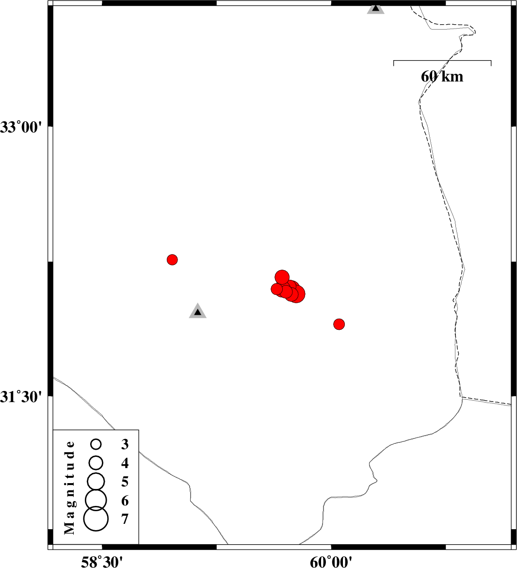 | 2023/11/01 | 10:39:44.7 | 14:09:44.7 | 32.098 | 59.679 | 8 | ML4.8 | Khorasan(south) Province, 59 km South-West of Sarbisheh | ||