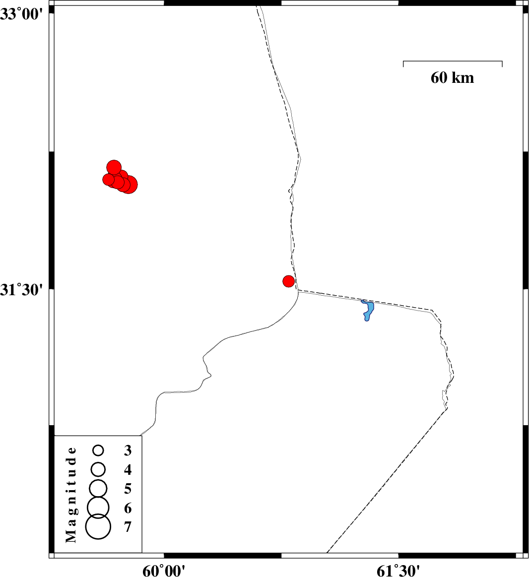 | 2023/11/01 | 10:39:44.7 | 14:09:44.7 | 32.098 | 59.679 | 8 | ML4.8 | Khorasan(south) Province, 59 km South-West of Sarbisheh | ||