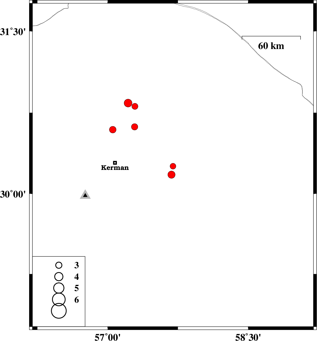 2021/03/11 | 09:19:29.8 | 12:49:29.8 | 30.177 | 57.681 | 12 | ML3.5 | Kerman Province, 59 km South-East of Kerman | ||